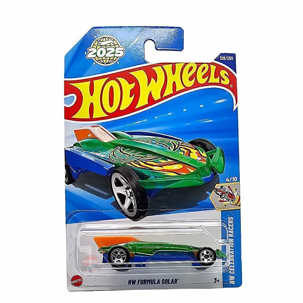 A miniatura Hot Wheels HW Formula Solar - HW Celebration Racers é um carro de corrida futurista movido a energia solar, com design aerodinâmico e cores vibrantes. Parte da coleção HW Celebration Racers, celebra a velocidade e a inovação, ideal para colecionadores e fãs de corridas.