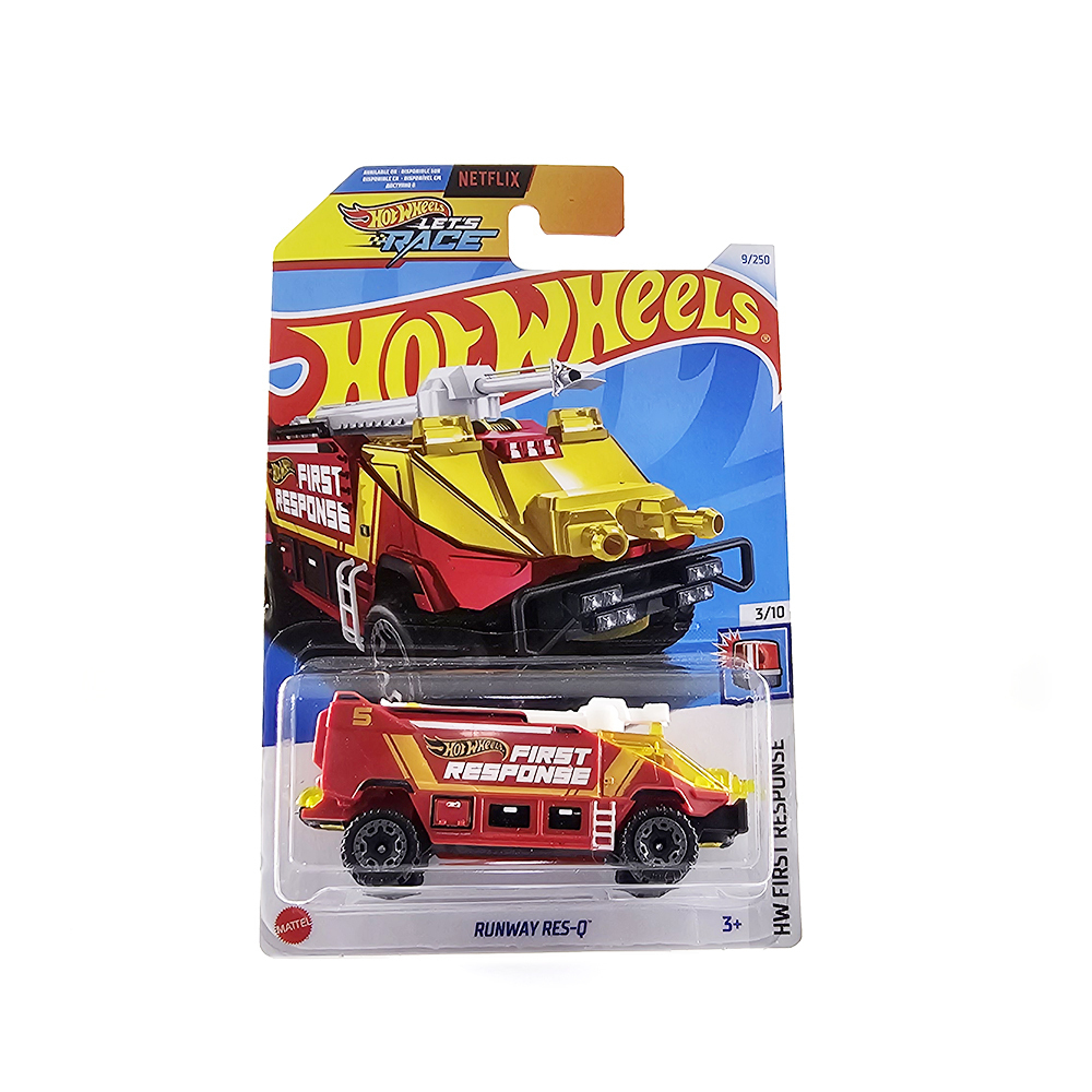 Hot Wheels é uma marca da Mattel que produz carrinhos de brinquedo em Die-cast, fabricação de modelos com metal injetado. Esse é o modelo Runway Res-Q que faz parte da coleção First Response. Essa miniatura aparece na série animada Hot Wheels Let's Race da Netflix.