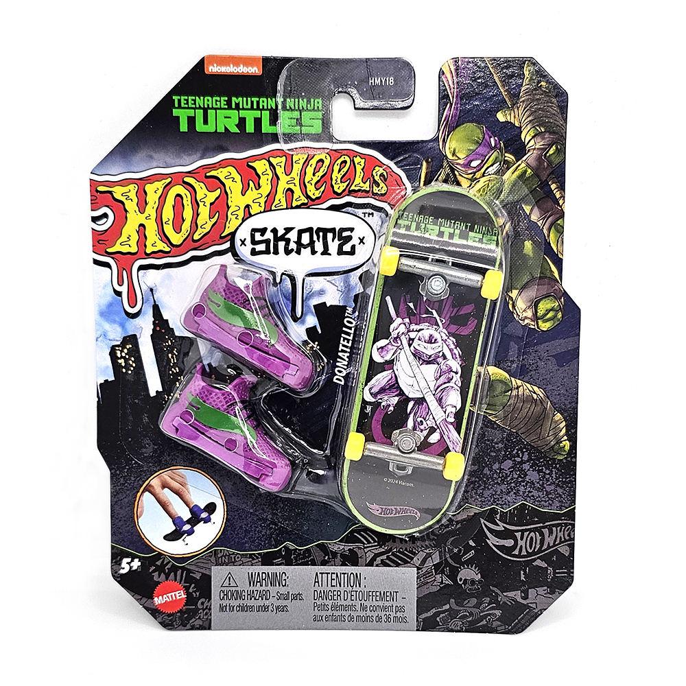 Hot Wheels é uma marca da Mattel que produz miniaturas colecionavéis, fabricação de modelos com materiais injetados. Os Skates de dedo Hot Wheels é uma parceria com a lenda Skatista Tony Hawk. Esse é o modelo com a arte do Donatello estampada no shape do Skate, faz parte da coleção Teenage Mutant Ninjas Turtles.
