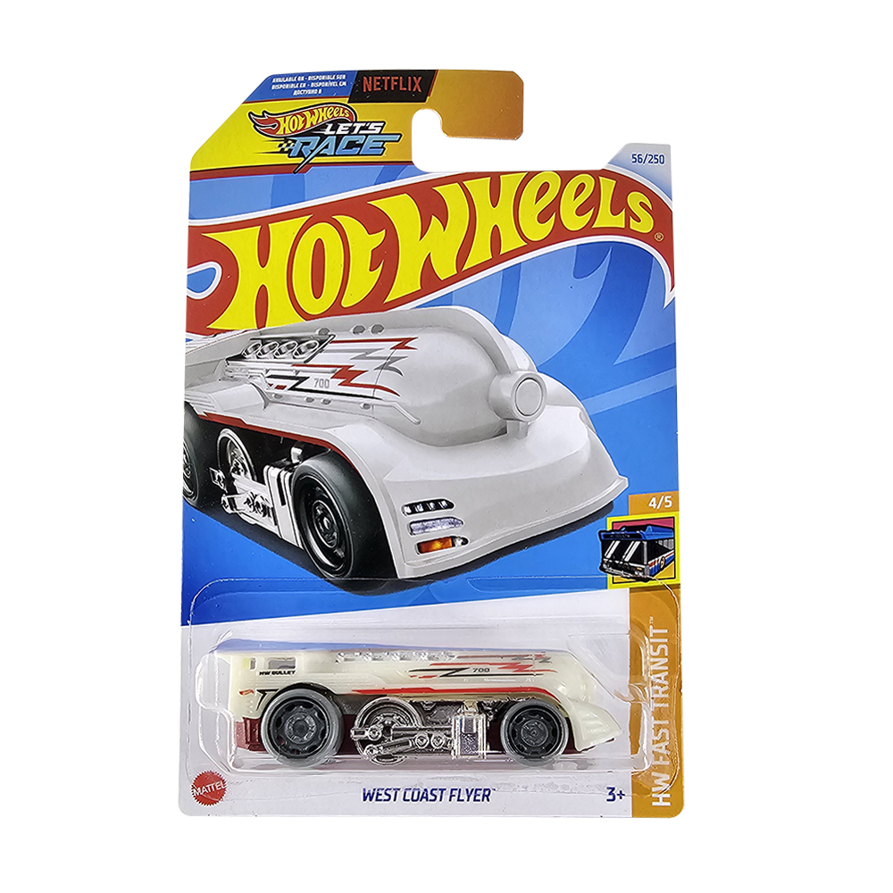Hot Wheels é uma marca da Mattel que produz carrinhos de brinquedo em Die-cast, fabricação de modelos com metal injetado. Esse é o modelo West Coast Flyer que faz parte da coleção Hw Fast Transit. Essa miniatura aparece na série animada Hot Wheels Let's Race da Netflix.