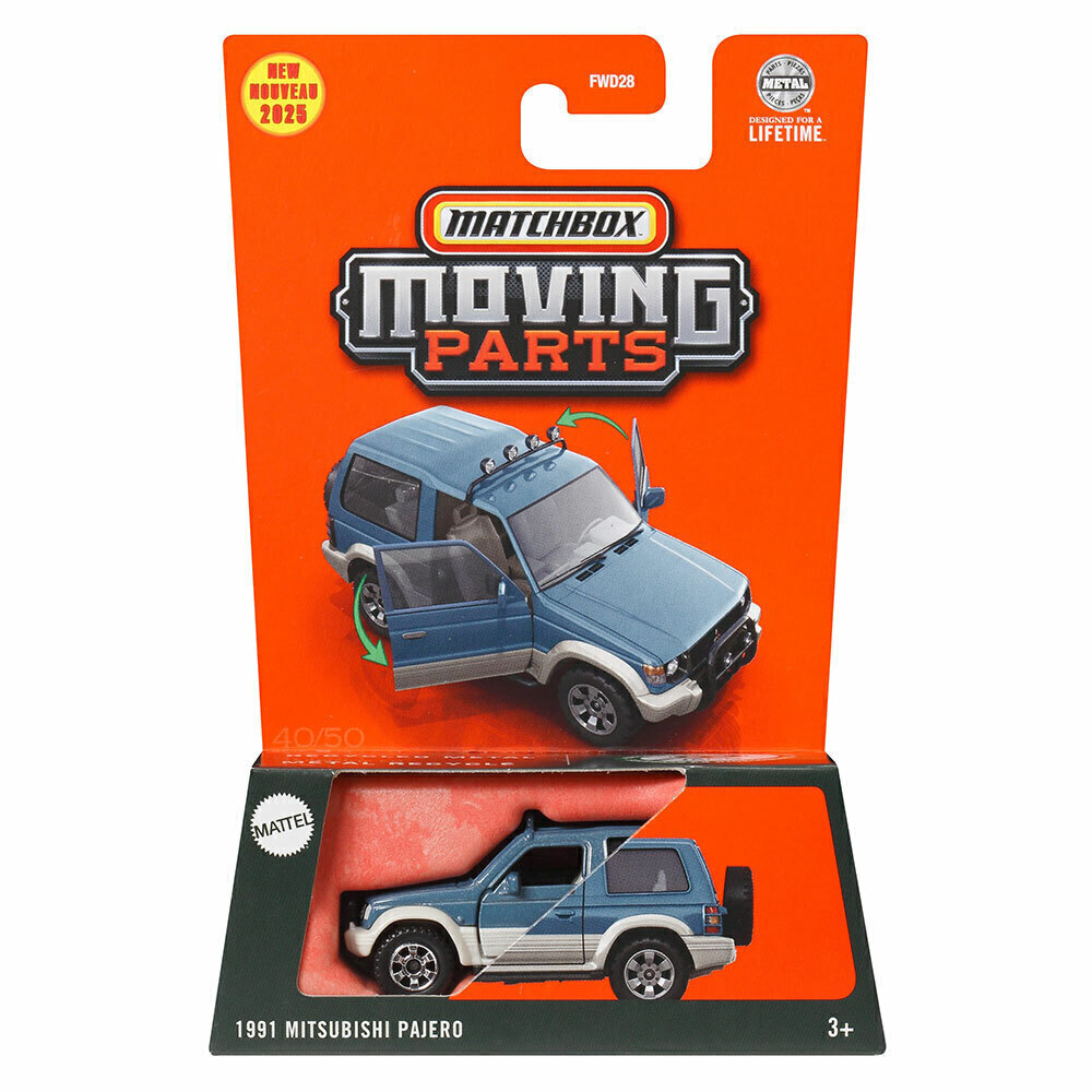 A miniatura Matchbox 1991 Mitsubishi Pajero – JBW66 pertence à série Moving Parts. Produzida em metal fundido (diecast) com base e rodas de plástico, chama atenção pelo capô e portas articulados, e pela suspensão elevada que simula a robustez do jipe off-road japonês. Um destaque para entusiastas de veículos 4×4 que apreciam interatividade em miniaturas.